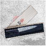 V českém překladu to znamená „vlny na vodní hladině“. A když se zadíváte na atraktivní damaškovou čepel, tak skutečně vypadá jako vlny na hladině oceánu. Je složena ze 101 vrstev damaškové oceli s jádrem z vysokořezné práškové oceli o tvrdosti HRC 60,5-61,5. Japonská tradiční oktagonová rukojeť „八角 柄“ je vyrobena z černého dřeva Plywood a je vkusně doplněna červenými proužky z micarty, na konci rukojeti je vyrytý znak Kanetsune. Způsob uchycení čepele rukojeti Etsuke je zde tzv. naražení na trn, kdy se čepel zahřeje a narazí se do rukojeti. Tento nůž je dodáván v luxusní dřevěné krabici s japonskou sayou (dřevěný kryt na čepel), který je vyroben ze dřeva magnolie s tradiční povrchovou úpravou "Kuro-Ishime".