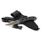 Fox USA Techno Reef. Celková délky 9 3/8". Čepel z nerezové oceli 440B s povlakem z nitrátu zlata a titanu, s vrchní vrstvou černého teflonu a částečně zoubkovaným horním ostřím. Kaleno na HRC 56-58. Full tang čepel. Rukojeti z Micarty impregnované černou epoxidovou pryskyřicí. Otvor pro lanko. Černé balistické pouzdro na opasek z cordurové oceli s gumovými popruhy na ruce