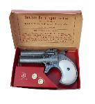 nefunkční replika "kapesního" dvouhlavňového revolveru DERRINGER v šedém provedení s perleťovou pažbou