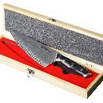 Robustní, velmi ostrý nůž Gyuto/Chef 8“ Dellinger HARUKAZE s délkou čepele 200 mm z damascénské oceli damascus steel s působivým designem a nejvyšší kvalitou. Hřbet nože a ostří se zužují do špičky pro všestranné využití mimořádné řezné síly. Krájení, plátkování, čištění masa, ovoce a zeleniny – nic nebude pro tento jedinečný nůž japonského tvaru problémem. Kuchařský nůž Gyuto Harukaze je díky výše položenému hrotu, též vhodný ke kolébkovému krájení bylinek, zeleniny a ořechů. Dlouhá čepel a rukojeť západního stylu Vám poskytne tu nejlepší kontrolu při řezání a krájení. Japonské umění, preciznost a nové technologie činí tento nůž z damascénské oceli (damascus steel) jedinečným a nenapodobitelným.